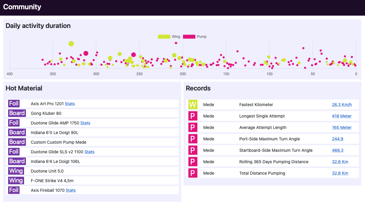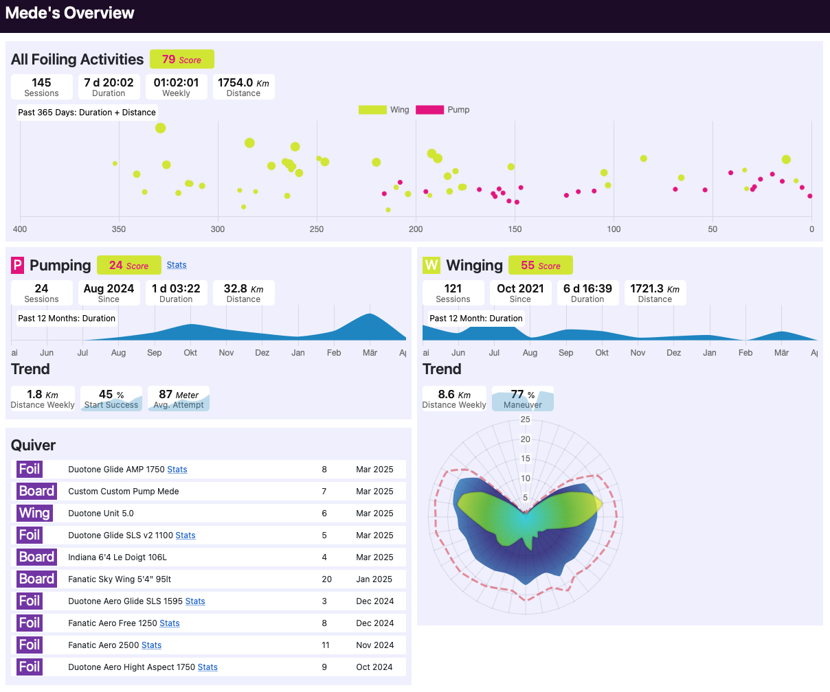 Foile.ch enables the upload and analysis of sessions from various GPS devices in one centralized location. Riders can compete on the community leaderboard, monitor individual progress, and explore insights and equipment statistics.