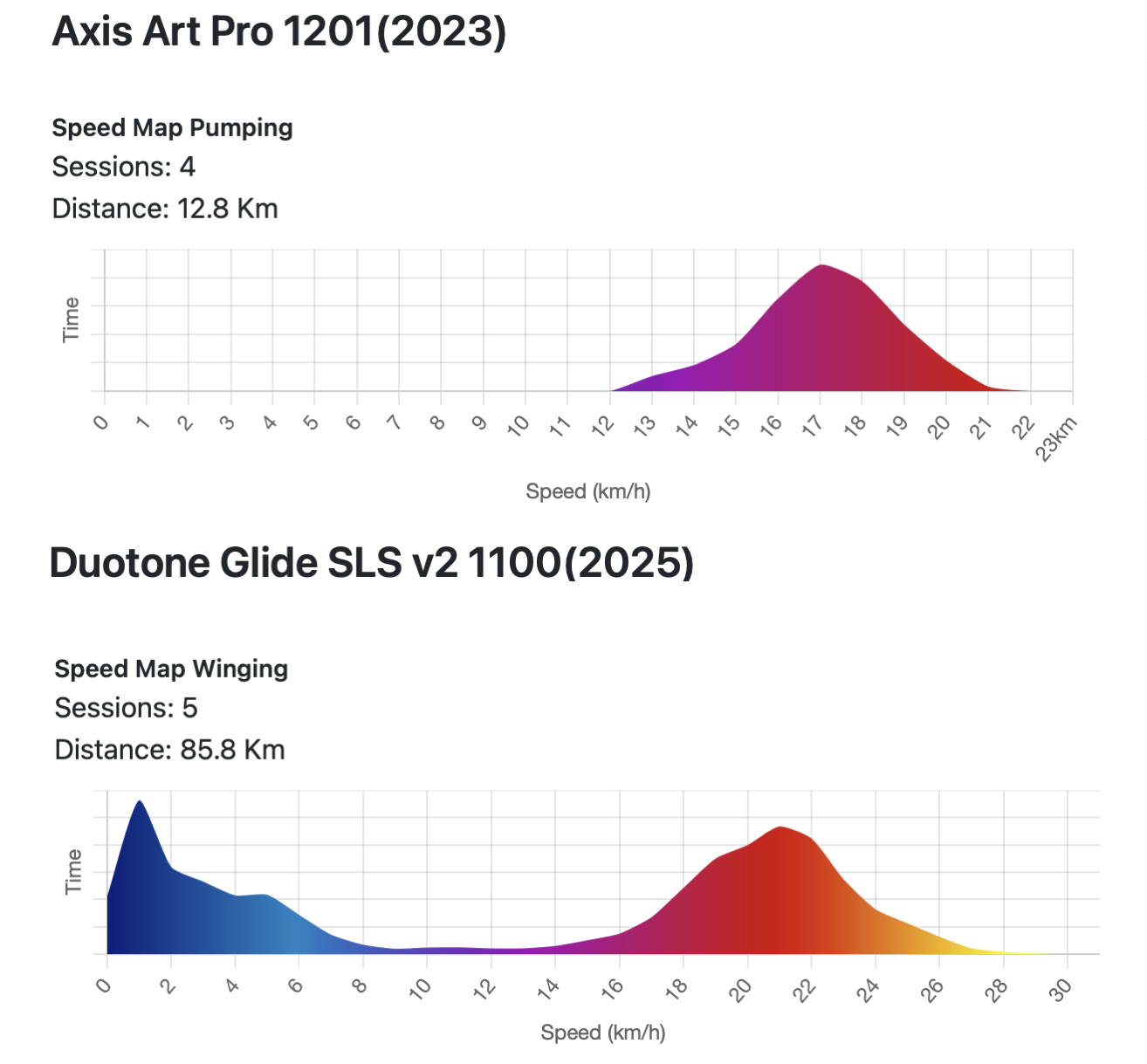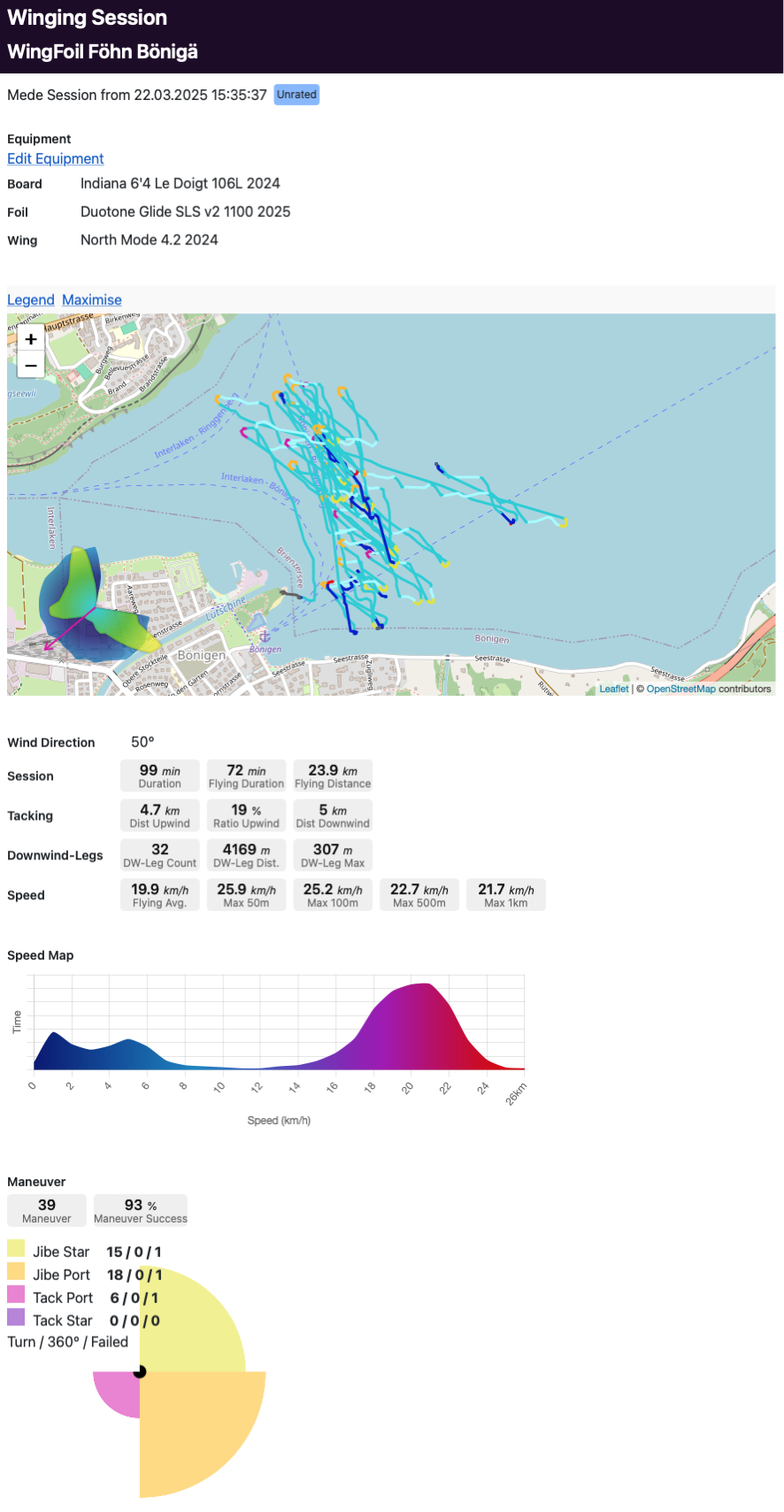 Foile.ch detects wind direction and counts your maneuvers—from starboard jibes to port tacks—offering insights into your performance. Through various charts, you can track speed patterns and gain a deeper understanding of your wing foiling equipment.