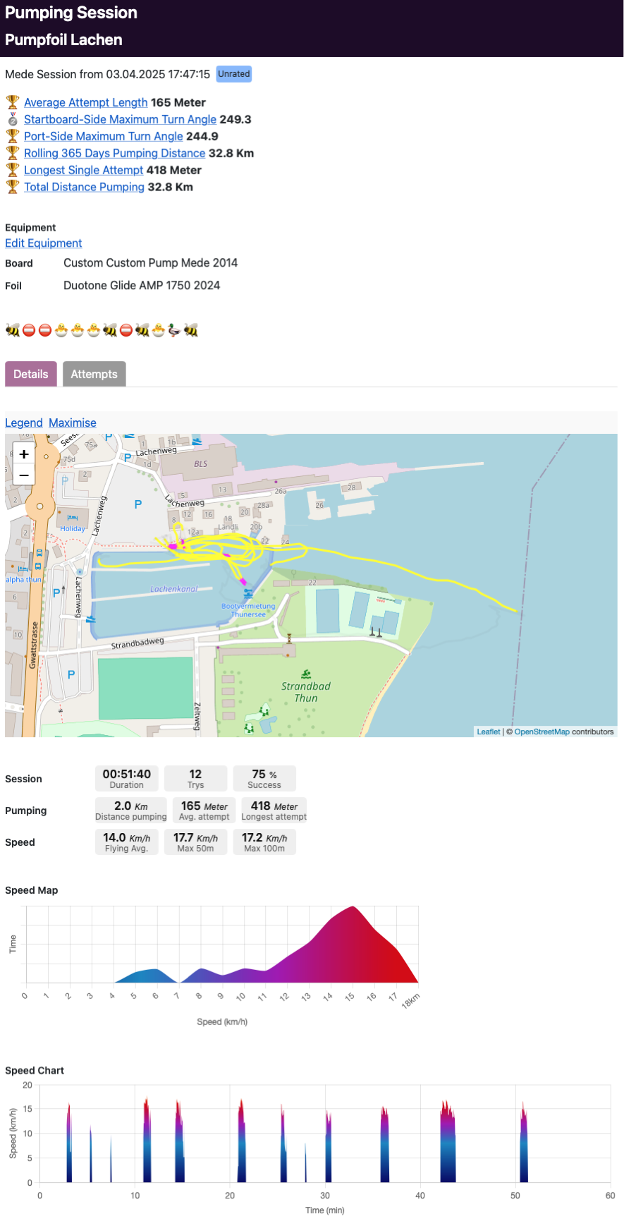 Foile.ch is a web platform designed to analyse the GPS tracks of foiling sessions and provide detailed reports. Special algorithms filter out disturbances, especially those occurring when crashing into the water what is a huge problem for foil pumping activities.